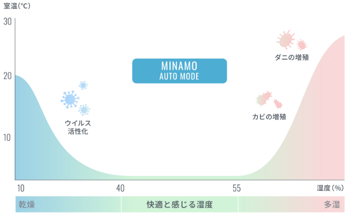 「MINAMO」が室温・湿度を感知し、オールシーズンで最適な湿度に自動調整。空気が乾燥しやすい冬はもちろん夏もエアコンによる乾燥対策に最適。さらに花粉の時期まで、季節の気候に応じて快適な湿度帯を細やかにコントロールし、乾燥や不快指数の上限を防ぎます。