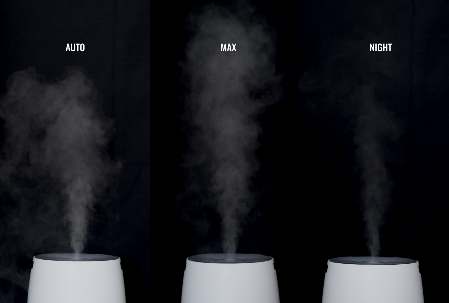 最適な湿度を自動調整する「オート」、最大加湿量を放出する「マックス」、静音動作の「ナイト」の3つのモードを搭載。乾燥状態や使用シーンに合わせてお選びいただけます。室内の湿度を1日中適切に保つことはインフルエンザなどの感染症対策にもつながります。