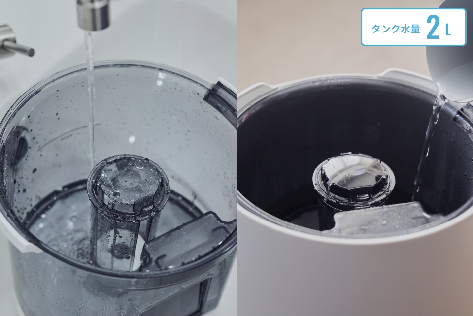 「MINAMO」はフタを開けて上から水を注ぐ給水方式を採用。水の入った重たいタンクを持ち運んだり、本体を移動させたりする⼿間が省け、使いたい時に素早く給⽔できます。